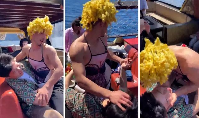Turistleri gezdiren bir tur teknesinden paylaşılan görüntülerde, 'önlük' giymiş bir erkeğin uygunsuz hareketler ve turistleri rahatsız eden davranışlar sergilediği görüldü.